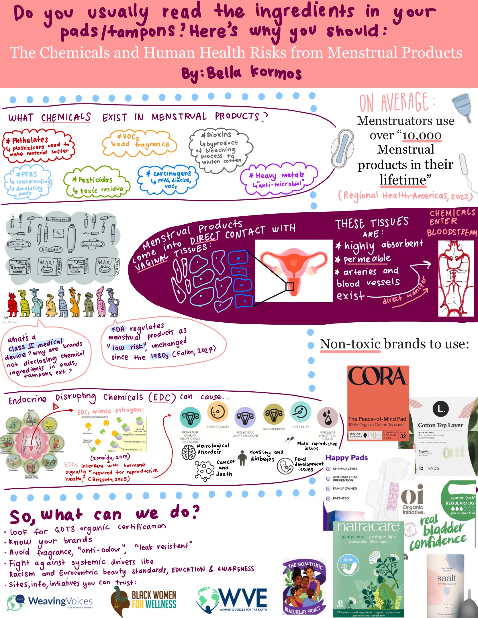 My key message is simple: menstruators deserve to know what they are putting in and on their bodies. This infographic was designed with all menstruators in mind, but specifically college students who may not even consider reading the ingredient lists in menstrual products. I hope to spread awareness of the chemicals present in menstrual products, and to educate menstruators on possible chemical exposures and health risks to using non-organic products. Before I started this research, I never thought about the possibility that my menstrual products could be exposing me to endocrine disrupters and carcinogens.